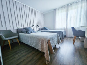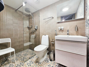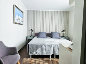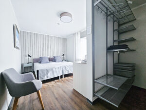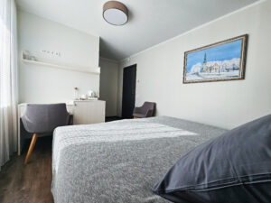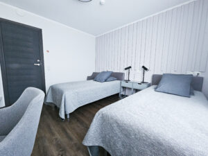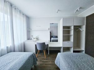 Tuba 1 Toas on 2 magamistuba (1a ja 1b). Igas toas 2 voodit. Dušš ja WC on 2 toa peale kokku. 1b toas on esikus riiulisüsteem. Mõlemas toas on külmkapp, kirjutuslaud, kohvi ja tee tegemise võimalus.